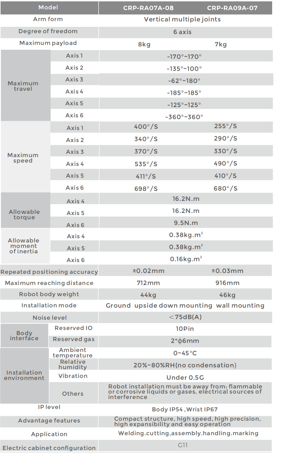 • The arm span is 712mm. It has strong payload capacity, and rated payload 8kg. It is easily applied in multi application.