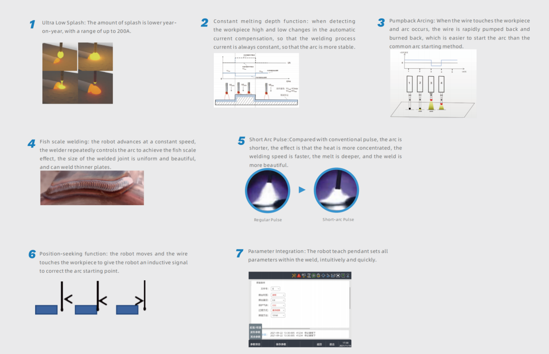 • Short arc pulse, beautiful molding, fast welding speed.