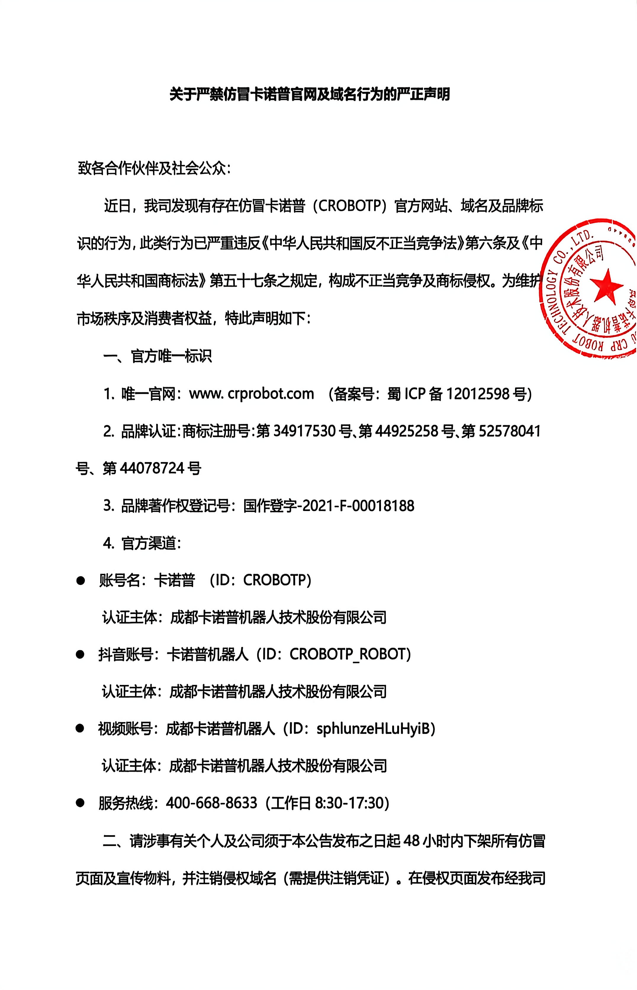致各合作伙伴及社會(huì)公眾:近日,我司發(fā)現(xiàn)有存在仿冒星空電競(jìng)(CROBOTP)官方網(wǎng)站、域名及品牌標(biāo)識(shí)的行為,此類行為已嚴(yán)重違反《中華人民共和國(guó)反不正當(dāng)競(jìng)爭(zhēng)法》第六條及《中華人民共和國(guó)商標(biāo)法》第五十七條之規(guī)定,構(gòu)成不正當(dāng)競(jìng)爭(zhēng)及商標(biāo)侵權(quán)。為維護(hù)市場(chǎng)秩序及消費(fèi)者權(quán)益,特此聲明如下:一、官方唯一標(biāo)識(shí)1. 唯一官網(wǎng):www. (備案號(hào):蜀ICP備12012598號(hào))2. 品牌認(rèn)證:商標(biāo)